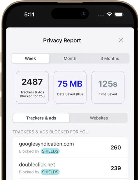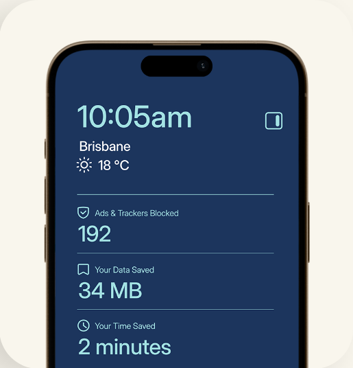 Your personalised, detailed privacy report that shows you how many ads, trackers and other creepy stuff we have blocked during your browsing session. Did you know that they use your data to power their monitoring machines? Which is a big deal on your mobile device.